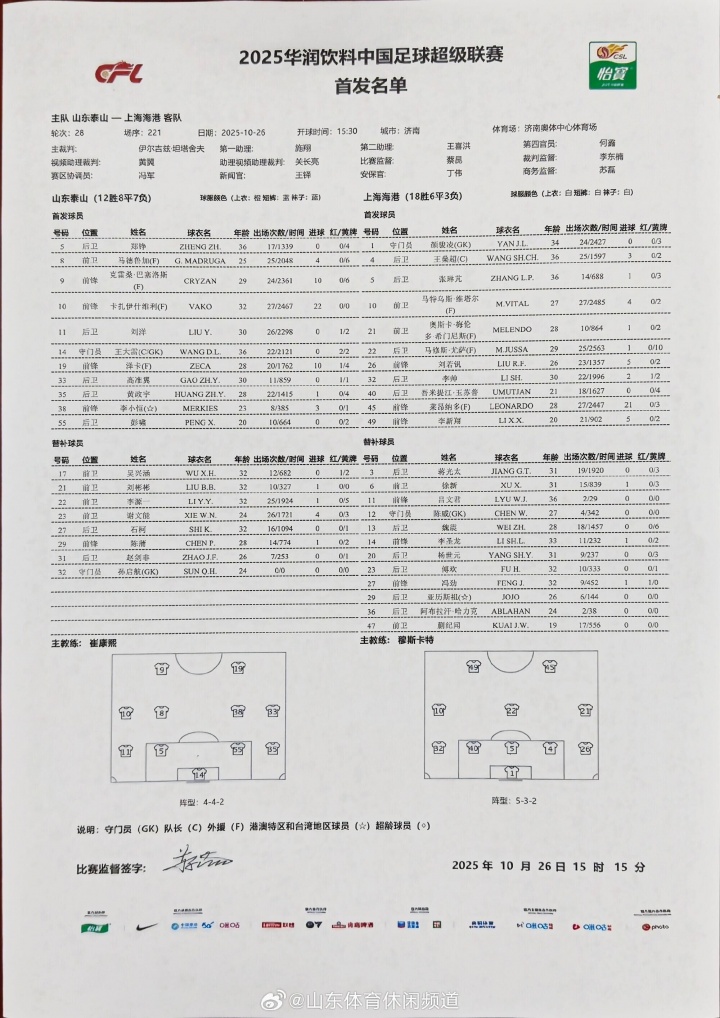 10月26日讯 中超第28轮,山东泰山主场迎战上海海港,比赛临近开球前,泰山首发名单调整,彭啸首发,洛佩斯取消首发。