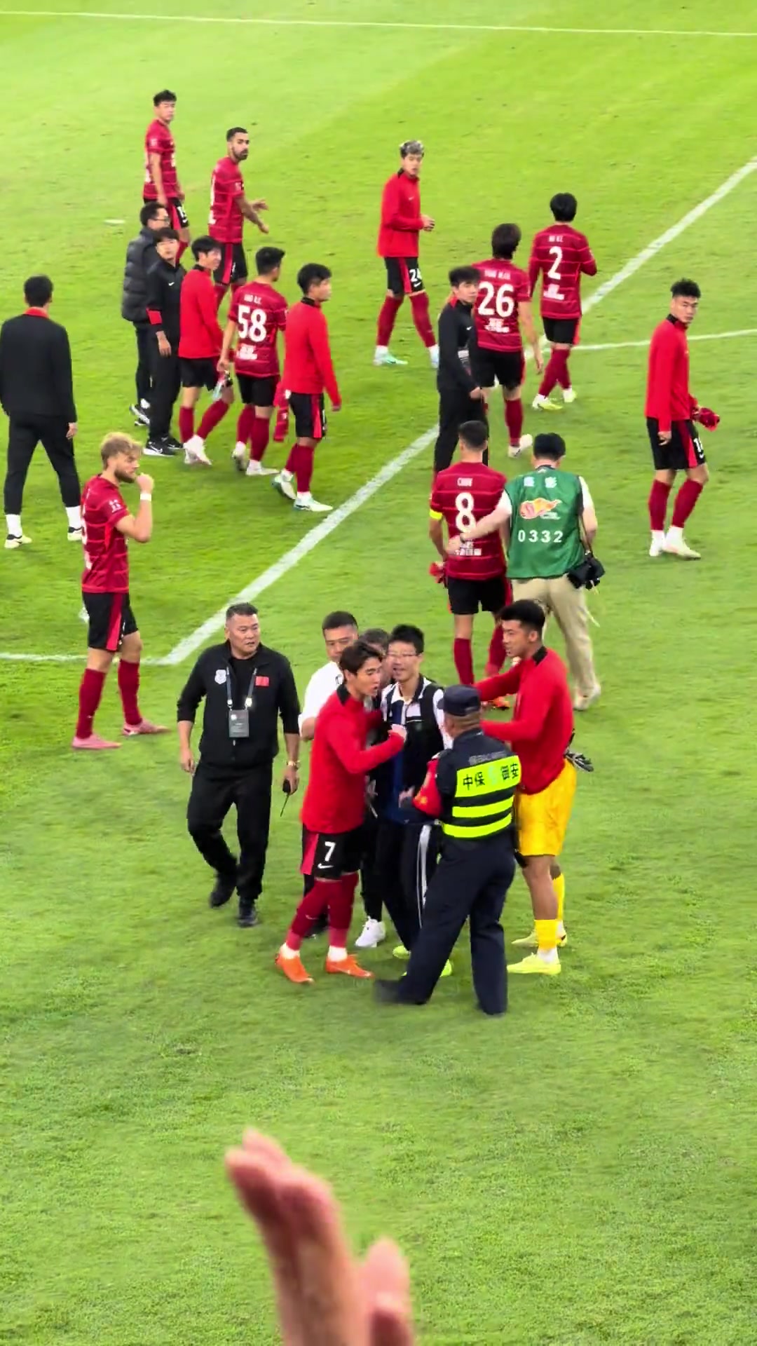2025-11-23 00:03:19小球迷赛后冲入场内,韦世豪示意安保人员松下手+与前者合影一张